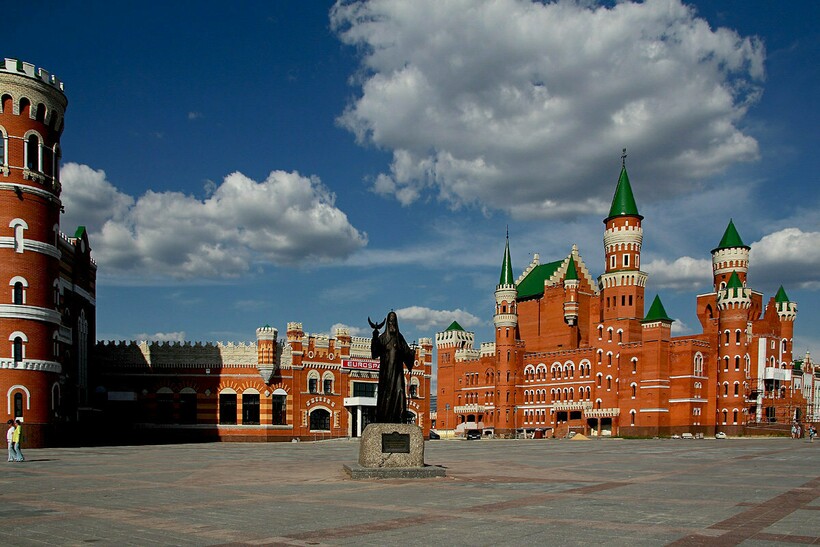Удобнее всего начать пеший маршрут по живописному променаду с его центральной части. Попасть на левый берег Малой Кокшаги со стороны Воскресенского проспекта можно через арку Спасской башни. Хотя пешеходная зона за аркой идет в обе стороны, лучше свернуть вправо, где сконцентрированы все главные достопримечательности набережной Брюгге в Йошкар-Оле — необычные здания и памятники.