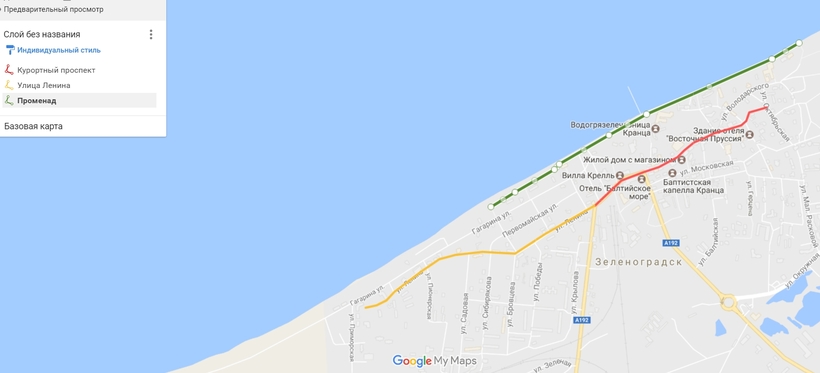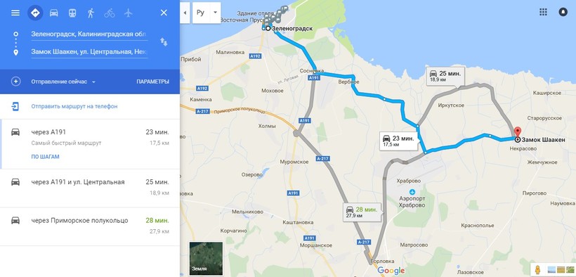 От порта в городе Балтийске до центра Зеленоградска останется преодолеть около 60 км. Часть пути будет пролегать через Приморское полукольцо, о котором я уже упоминала, скоростную автомагистраль А-217. На карте показаны варианты путей следования от порта Балтийска до центральной площади Зеленоградска. Независимо от того, какой путь выбрать, займет он примерно час.