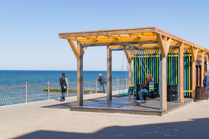 Самые романтичные фото променада Зеленоградска получаются около веревочных качелей с видом на море и пляж. Качели установлены под навесом, и даже в дождь на них можно увидеть взрослых и юных посетителей.
