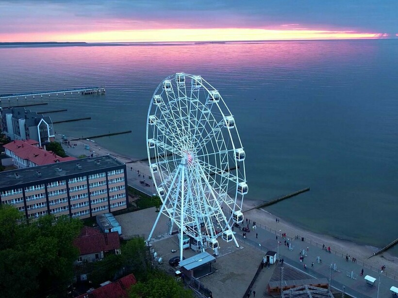 На изображении с веб-камеры променада видно колесо обозрения. Главный аттракцион прибрежной зоны называется «Глаз Балтики». Высотой колесо 50 м. С верхней точки прекрасно видно весь Зеленоградск и бескрайнее Балтийское море. Вечером на колесе обозрения включается подсветка ,и аттракцион становится еще более впечатляющим. Цена билета за одного человека в 2021 году составляла 500 руб. Все, кто поднимался в застекленной кабине на головокружительную высоту, уверяют: впечатления стоят затраченных денег. Если внимательно смотреть онлайн-камеры променада Зеленоградска, можно увидеть пассажиров колеса обозрения.