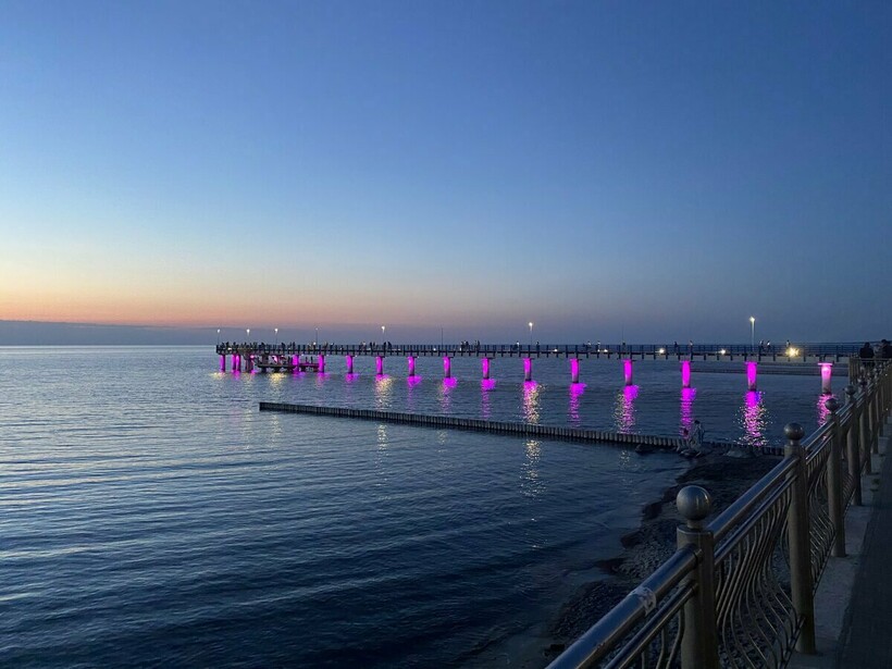 Еще одна достопримечательность пляжа — пирс. Он стоит на бетонных сваях и выходит в море на 150 м. В конце причала расположена смотровая площадка. Глубина моря под ней — 5 метров. Прыгать в воду с пирса опасно. Лучше наслаждаться волнами, стоя у парапета, тем более что вечером на пирсе включается подсветка.