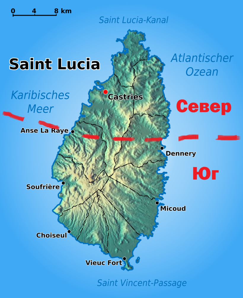 Площадь острова, который занимает Сент-Люсия, едва превышает 600 км² — эта цифра сопоставима, например, с площадью Мадрида. Так что, и об особом делении на разные регионы говорить не приходится. Однако я бы предложила условную классификацию на север и юг.