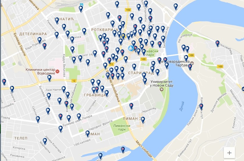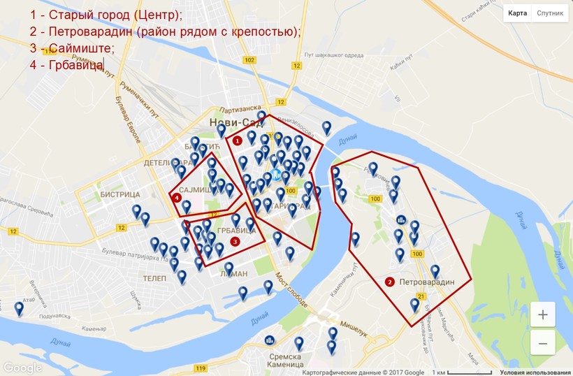 Насчет отелей Нови-Сада я, честно говоря, не знаю, но хостелы мне понравились. Вообще от хостелов там одно название: скорее это мини-гостиницы или гостевые дома с комнатами, рассчитанными на двух-трех человек. На карте красными значками отмечены хостелы. Как видите, они есть в любом из отмеченных мной четырех районах, так что вариант для себя найти очень легко. Сравнить цены на разные хостелы или отели можно попробовать тут.