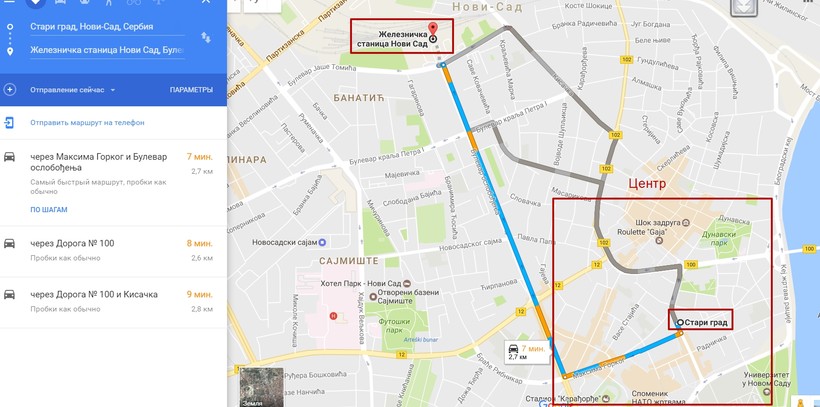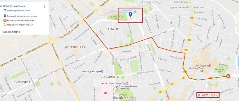 Добраться до Центра можно все на том же автобусе № 3А. Если вы хотите попасть в Старый город, лучше всего выйти на остановке «Бульвар Михаила Пупина» (красная линия маршрута).