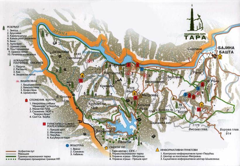 Здесь вы можете посмотреть карту заповедника Тара вместе с природнымии культурными достопримечательностями. Правда, она на сербском языке, но в принципе, понять, что написано. можно.