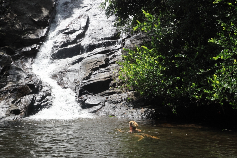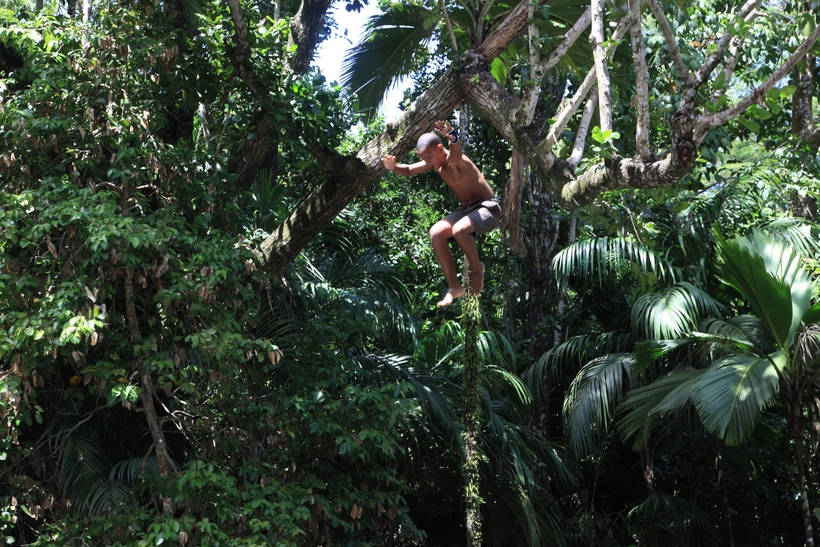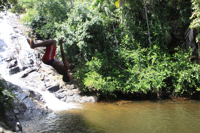 Единственная опасность здесь — скользкие камни и маленькие сейшельва, то и дело падающие сверху как сливы. Они забираются высоко на деревья и прыгают в озеро, выделывая сальто.