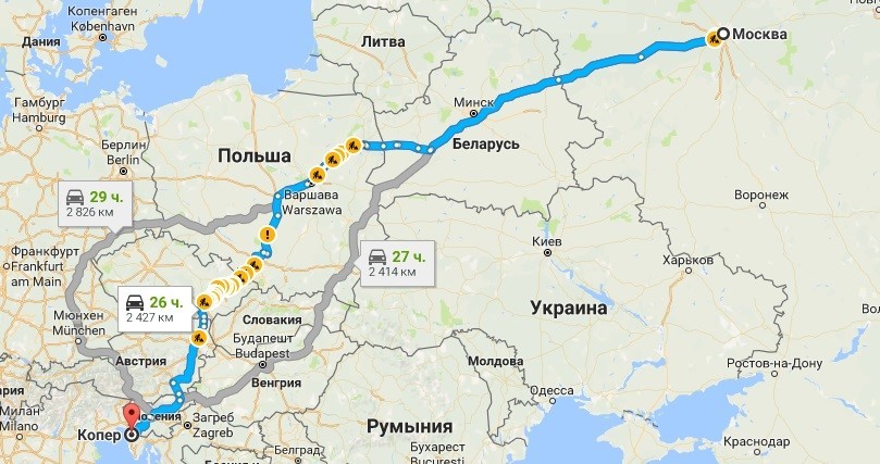 Если вкратце описать маршрут на машине, то выглядит это, примерно, так: Москва – Белоруссия – Польша – Чехия – Австрия – Словения, приблизительно 2500 км и время в пути… зависит от вашего возраста, целей, наличия детей и здоровья.