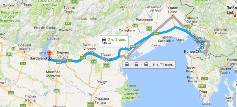 - Gardaland, Италия, Верона, озеро Гарда. Расположен в 316 км от Копра.