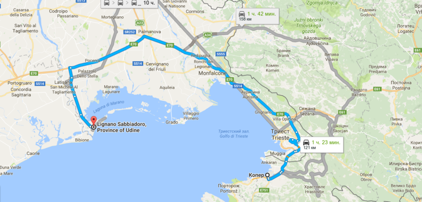 От ж/д вокзала Местре поездом добираемся до ж/д вокзала Триеста, расписание поездов здесь. Стоимость – от 13 до 30 EUR, зависит от класса, которым вы собираетесь путешествовать, затем из Триеста едем до Копра на такси за 30 EUR.