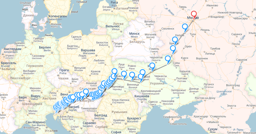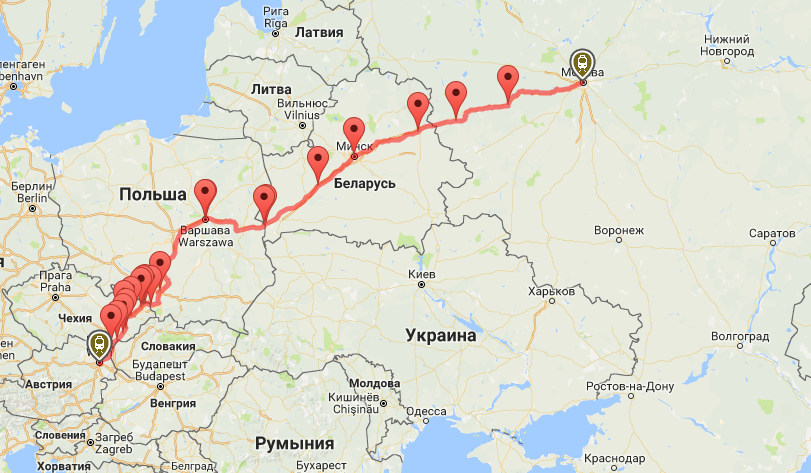 Разумеется, это предложение действительно только летом. Время в пути – 2 дн. 13 часов. Маршрут проходит через Украину, Белоруссию, Венгрию.