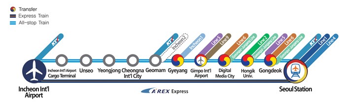 Дорога до Сеула на метро займёт около часа и будет стоить меньше 5000 вон (5 USD). Без пересадки можно добраться до аэропорта Кимпхо, района Хондэ (университет Хоник) и Сеульского вокзала. До последнего можно без остановок добраться на экспрессе, однако для этого билет нужно покупать отдельно.