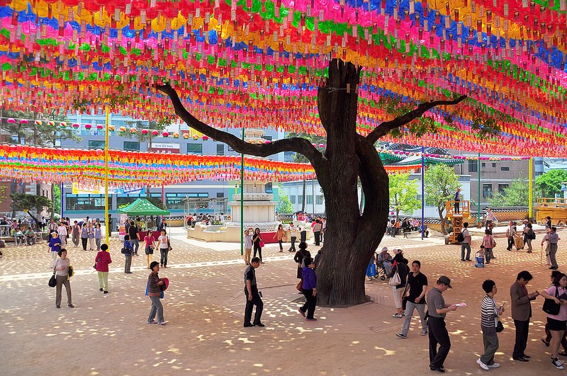 Я была здесь на День рождения Будды, когда храм украшается разноцветными фонариками, которые зажигаются в тёмное время суток. Это очень-очень красиво, поэтому советую по возможности зайти сюда на весенний или осенний фестивали фонарей.