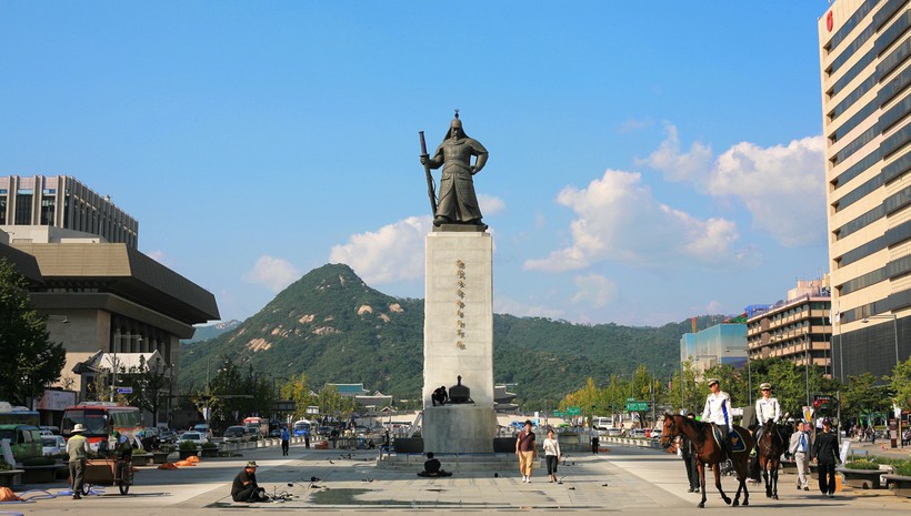 - Площадь Кванхвамун. Расположена в самом сердце Сеула, перед дворцом Кёнбок, именно здесь проходили демонстрации против президента в 2016-2017 году. На площади установлены монументы корейскому полководцу Ли Сунсину и создателю корейского алфавита королю Сечжону. Музей, посвящённый им, размещается прямо под площадью. Попасть туда можно из подземного перехода или воспользовавшись входом позади памятника Сечжону. В летнее время на площади работают фонтаны, где очень кстати можно охладиться.