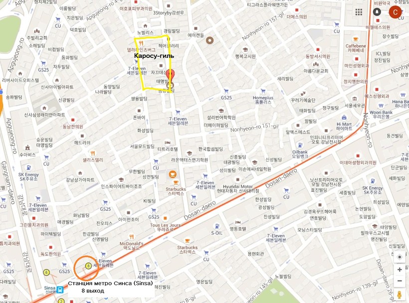 Это улица одного из самых модных районов Сеула, которую часто посещают местные знаменитости. Здесь сконцентрированы магазины одежды, галереи, кафе и рестораны, а большинство людей, которых встречаешь здесь, одеты особенно со вкусом.