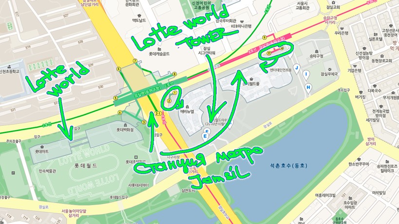 - Метро. Ближайшая к парку станция метро называется Jamsil Station и находится на пересечении зеленой и розовой веток метро. Я считаю, что метро – это самый оптимальный вариант чтобы добраться до места назначения быстро и недорого. Проезд на метро обойдется вам до 5000KRW(4,3$)