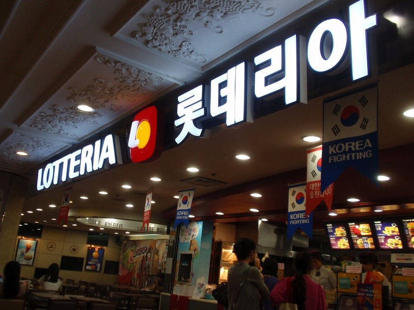- Lotteria (Находится в крытой зоне Adventure). Lotteria – это самая известная бургерная в Сеуле. У этой сети кафе очень много точек быстрого питания, разбросанных по всему Сеулу, поэтому подкрепиться в ней можно не только в Лотте Ворлд. Там действительно недорого и очень вкусно готовят. Когда приезжаем в Сеул, иногда забегаем туда перекусить! Средний счет на семью из трех человек составляет – 20100KRW(17$)