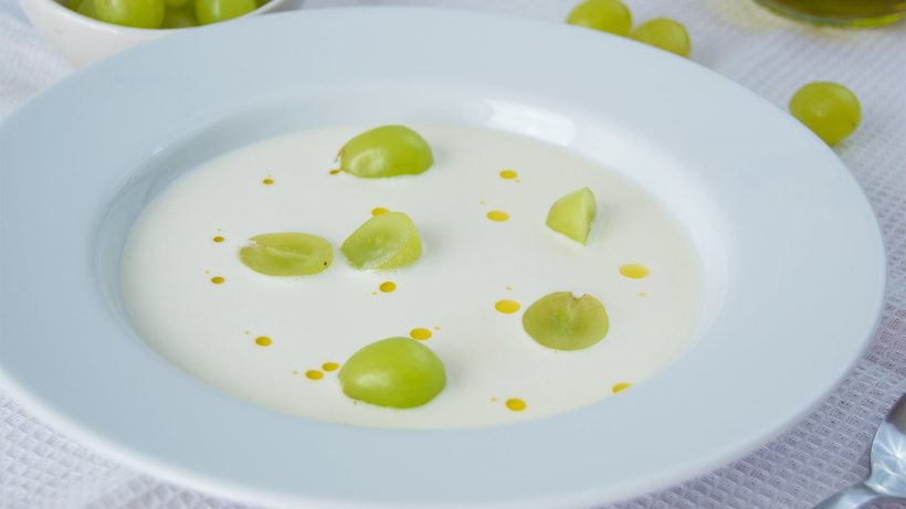 - Ахобланко (ajo blanco) – восхитительно нежный суп для гурманов. Главная его составляющая – миндаль (!). Он перетирается и смешивается с водой, хлебом, чесноком и оливковым маслом. Это просто божественно вкусно! Подается с виноградом и ломтиками дыни. Особенно распространен в Малаге, где 2 августа ежегодно проходит целый фестиваль, посвященный этому чудесному супу.