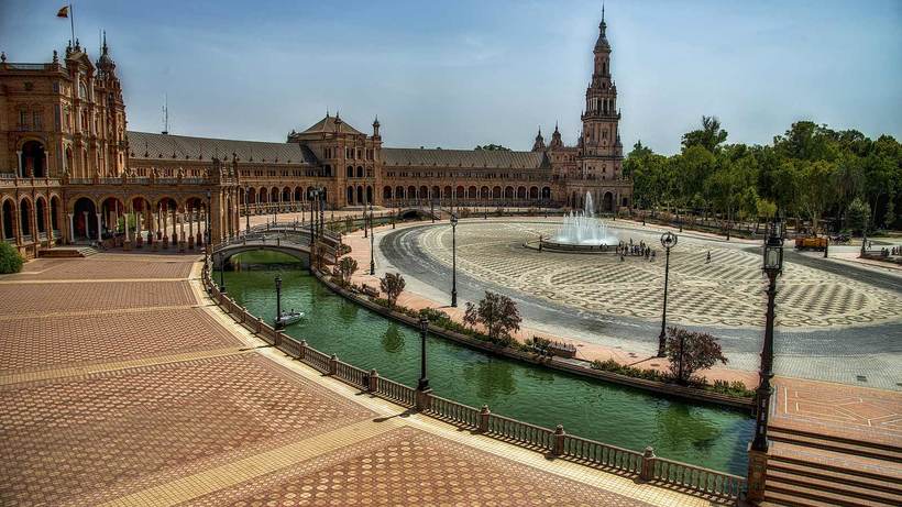 - Площадь Испании (Севилья) – относительно новая (1929 г.), но мне полюбившаяся достопримечательность в нео-мавританском стиле, который, по-моему, отлично гармонирует со старинной Севильей! Я встретила в путешествии туристку из Японии, которая рассказала, что ходит на Площадь Испании ежедневно по три раза, так она ей приглянулась. Площадь Испании имеет полукруглую форму и состоит из множества арочных павильонов, посвященных разным городам Испании. Мозаикой и плиткой выложены их карты и достопримечательности. Посередине площади – замечательный фонтан, а по периметру исксственный водный канал с миниатюрными лодочками и утками. Все вокруг очень чисто ухоженно, много пальм и розовых кустов. Рекомендую посетить Площадь Испании как в дневное, так и вечернее время: она смотрится совершенно по-разному!