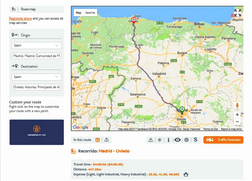 Поездка из Мадрида в Овьедо займет около 4 часов чистого времени. Весь путь пролегает по отличной многополосной трассе, есть платные участки, общая сумма за пользование дорогами составит 22.5 EUR. Планировать расходы на платные дороги можно при помощи этого сайта.