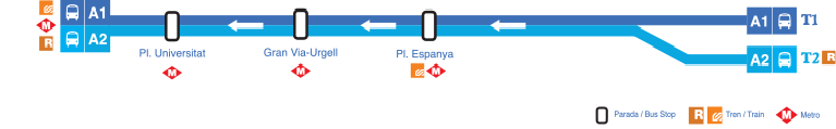 Добраться из аэропорта «Эль Прат» до города можно несколькими способами. Каждые 10 минут от него отходит комфортабельный автобус Aerobus. В нём есть Wi-fi, зарядка для USB, и примерно за полчаса он может доставить вас до Площади Каталонии. В большинстве случаев я пользуюсь именно таким вариантом трансфера, потому что это быстро, удобно и дешево. Судите сами: решив доехать до города на такси, вы потратите около 30 евро, в то время как билет на Aerobus обойдется вам в 5,90 евро. Подобные автобусы работают с 5:30 до 1:30. Ниже можно посмотреть схему, на которой указаны промежуточные остановки.