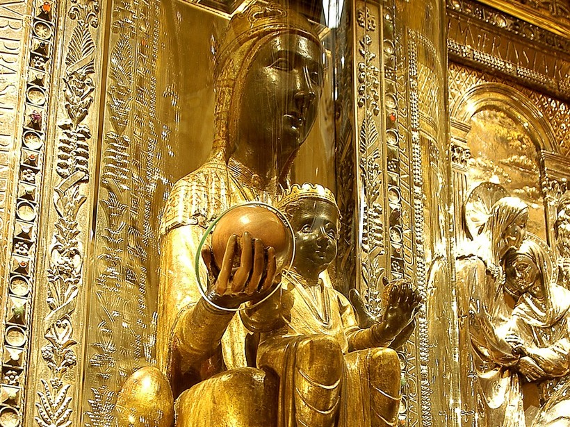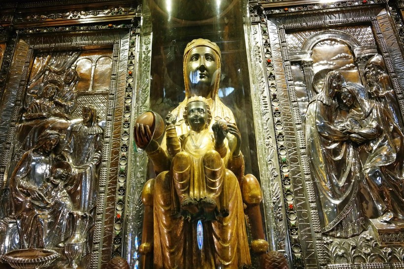 Как мне показалось, Дева Мария Монсерратская достаточная миниатюрная женщина – ростом всего 95 сантиметров. Для нас, православных, немного странно, что Дева Мария изображена с сидящим Младенцем на коленях и держащей в правой руке сферу, которая, как говорят, символизирует вселенную. Младенец Иисус, в свою очередь, правой рукой благословляет всех верующих, а в левой руке он почему-то держит ананас.