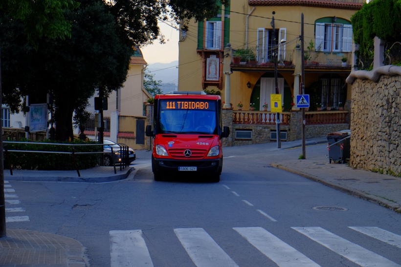 На улице, недалеко от выхода будет остановка автобуса № 111. Ее точное название — Funicular de Vallvidrera - Pl Pep Ventura. Этот автобус довезет вас прямо до вершины горы Тибидабо (конечная напротив храма Святого Сердца). Он красного цвета и небольшой, по виду напоминает скорее нашу маршрутку. Это также общественный транспорт, поэтому к валидатору прикладываете все тот же начатый проездной. Ехать около 10 минут до остановки Colоnia Tibidabo (их не объявляют, но храм сложно не заметить). Единственная сложность, автобус № 111 ходит не часто (раз в полчаса), поэтому необходимо заранее посмотреть расписание на сайте.