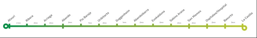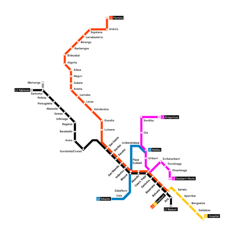 Метро представляет собой единую линию, проходящую по Бильбао и делящуюся на две ветви после станции «San Inazio». Одна из ветвей проходит от «Etxebarri» до «Plentzia»; другая – от «Etxebarri» до «Santurtzi».