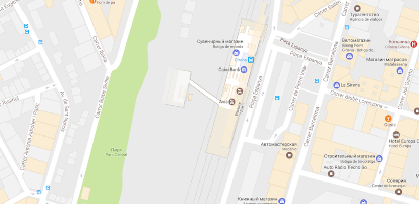 Если из Москвы летели в Жирону, то вам по аналогии с Барселоной, после схождения с небес, нужно отыскать автобусы. Это просто — двигайтесь по указателям в сторону estación de autobuses. Выбирайте тот, что идет на железнодорожную станцию — она estación Girona. На всякий случай карта и адрес: