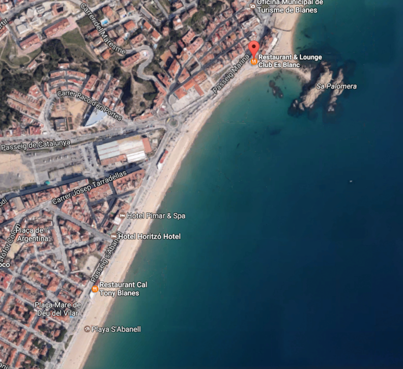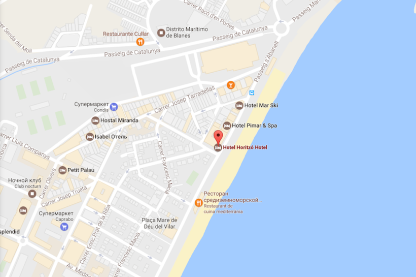 - Hotel Horitzo & Spa — громадина на берегу Средиземного моря, на главном пляже города. Поселиться получиться за 110 EUR в сутки. Адрес: Passeig de Abanell, 11 Blanes 17300. Пассеч де Абанель, 11 Бланес 17300