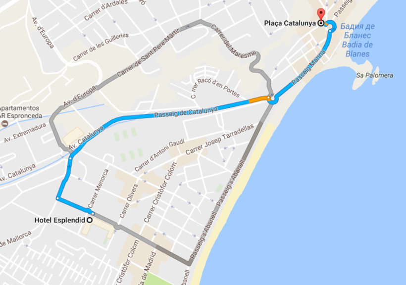 - В одном квартале с Petit Palau и в метрах четыреста от пляжа имеется еще одно симпатичное жилище — Hotel Esplendid. Три звезды, пару лет назад отремонтировался. Цена 40-50 EUR. Центр города от гостиницы как Париж от Москвы. Адрес: Avenida Mediterráneo, 17 Blanes 17300. Проспект Медитерранео, 17 Бланес 17300