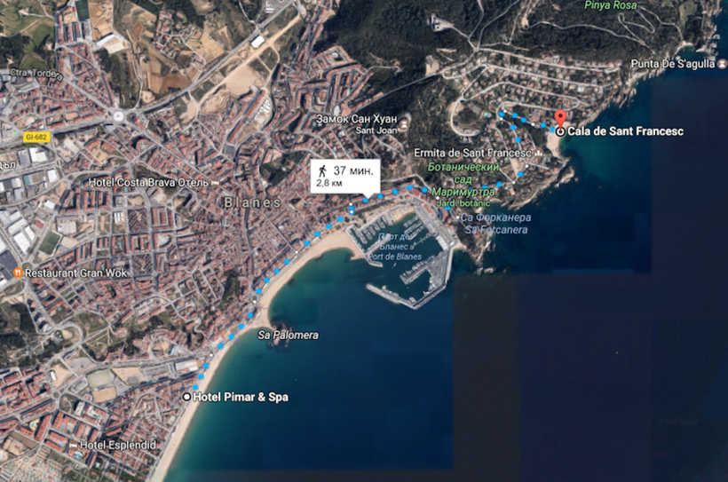 - С октября до мая основная часть отелей, как я уже говорила, закрыты. Из тех, что ждут гостей люблю Hotel Costa Brava. Три звезды и километр от центра, на карте районов города — 3. Очень средненький, но я обожаю дедушку на стойке регистрации. Мы с ним дружим. Поэтому когда требуется ночлег зимой я отправляюсь к старичку. Обычная стоимость комнаты — 50 EUR в сутки, летом может быть и 100. Адрес: Carrer d’Anselm Clavé, 48 Blanes 17300. Улица Ансельм Клаве, 48 Бланес 17300