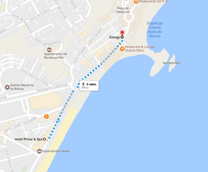 - На мой капризный и придирчивый вкус, лучшим отелем в поселке стал совсем не самый звездный — Hotel Pimar & Spa. Трешка. За что он мне по душе? За вкусную еду, на завтрак, обед и ужин. За 30 секунд до моря. За близость к центральной ярмарке испанских ручных поделок. За веселую программу каждый вечер. За бассейн на крыше и теплые воспоминания, встреченных здесь дней. Единственный минус — коктейли в баре. Ну вот совсем так себе напитки. Если будете здесь отдыхать, выбирайте национальную сангрию, она бомбическая. На стойке регистрации персонал говорит по-русски. Жизнь у моря — 60 EUR в сутки. Адрес: Passeig S’Abanell, 8 Blanes 17300. Пассеч Сабанель, 8 Бланес 17300