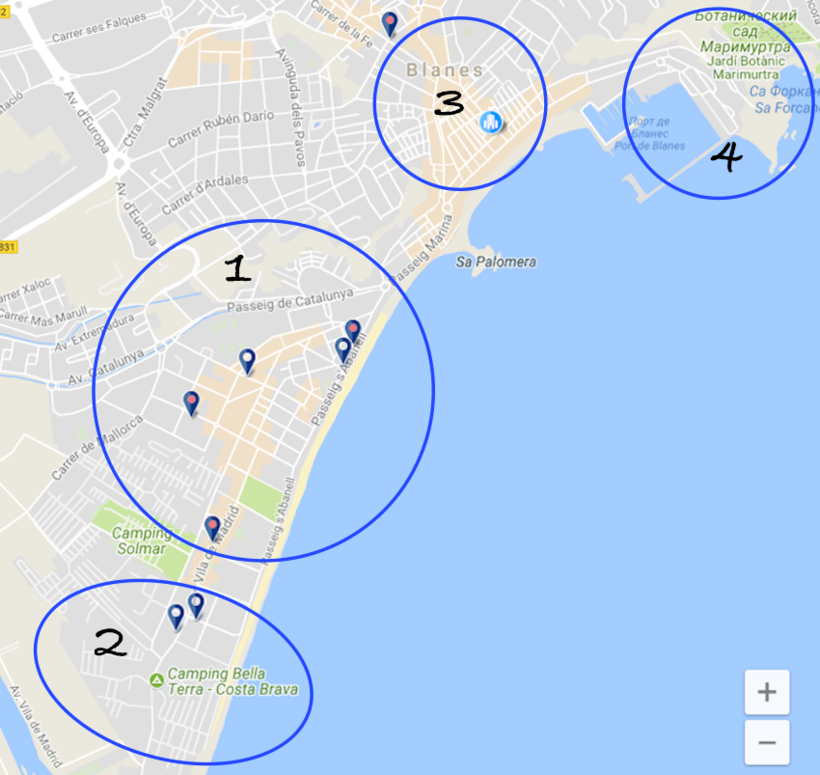 Теперь про гостиницы туристического района, номер 1 на карте Бланеса.