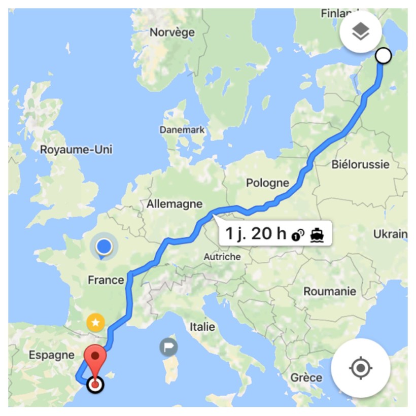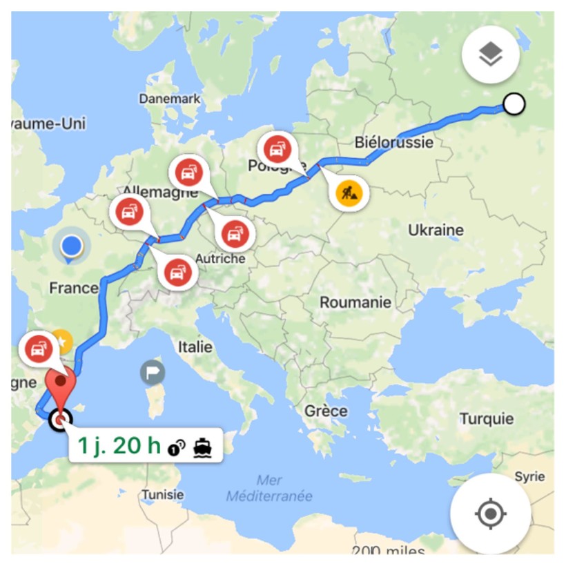 Расстояние чуть меньше, 4 030 км. Ну а путь почти такой же через - Белоруссию, Польшу, Германию, Францию и Испанию, до Барселону. А там тот же маршрут паромом.