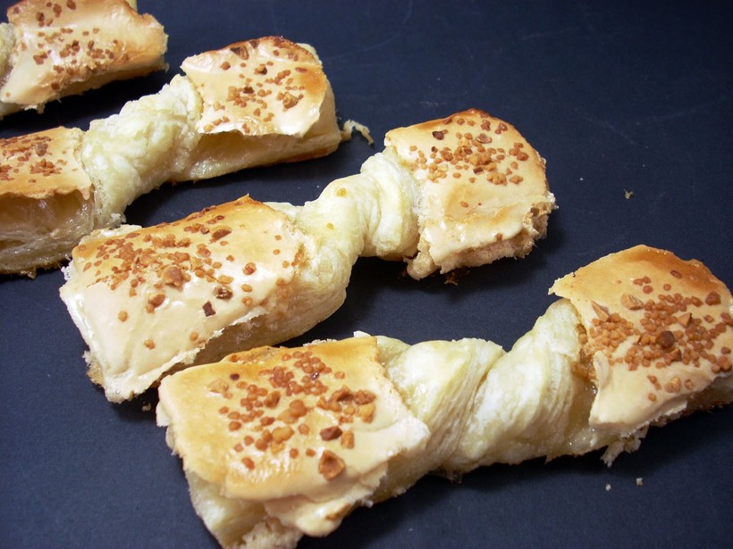 - Corbatas de Unqera. Мы бы назвали печенье такой формы «бантики», а здесь оно зовется «галстуки». Слоеное тесто, покрытое миндальным пралине.