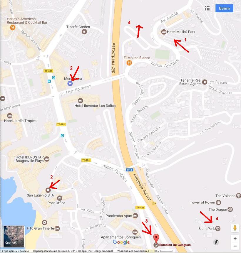 Хорошая новость для тех, кто привык вести сидячий и мало подвижный образ жизни. У таких людей есть возможность серьезно поправить здоровье и натренировать сердечно-сосудистую систему – на всем острове, включая такие крупные города, как Санта-Круз, практически нет горизонтальных тротуаров. Вы всегда деле либо спускаетесь, либо поднимаетесь. В частности, чтобы сходить в близлежащий супермаркет Mercadona на пересечении улиц Gran Bretana и проспекта de los Pueblos – горка очень крутая буквально от порога дома до самого магазина (спуск) и потом обратно. Местные жители, правда, приспособили для походов за продуктами специальные сумки на колесиках, которые (конечно же) находятся в свободной продаже. Приличные супермаркеты шаговой доступности есть также в самом Малибу Парк, на первом этаже. Впрочем, как и везде.