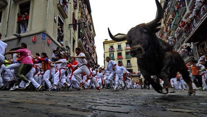 Начиная со следующего дня, 7 июля, и до 14 июля ежедневно в 08:00 проходят энсьеррос, бега быков и людей. Когда-то быков просто вели по улицам города на Plaza del Castillo, служившую в те времена ареной для корриды. В 1856 году впервые происходит то, что привлекает сейчас миллионы людей: перед быками, бросая вызов судьбе, бегут смельчаки. Первыми, говорят, были мясники с рынка Сан-Доминго.