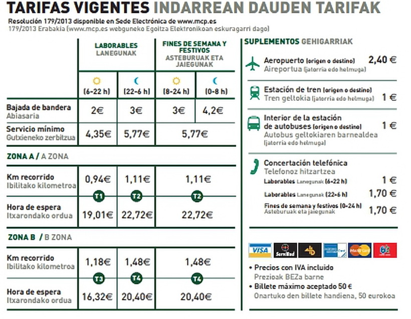 Оплата — по счетчику, чаевые обычно составляют мелочь при округлении суммы. Тарифы такси регулируются законодательно, все цифры представлены на транспортном сайте Памплоны.
