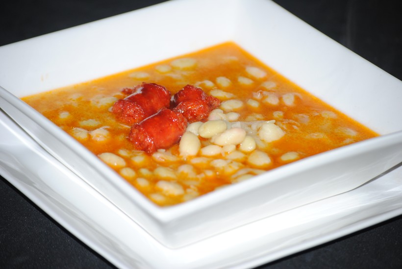 Белая фасоль с перцем, помидорами, луком-пореем, морковью, чесноком и чисторрой. Чисторра — это вид колбасы типа чорисо, традиционный для северных областей Испании.
