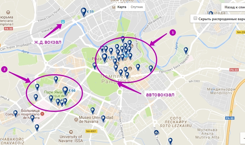 Благодаря небольшим размерам Памплоны, остановиться здесь можно в любом месте, но удобнее всего, конечно, в историческом центре (цифра 1 на карте). Большинство отелей и апартаментов предлагается именно здесь.