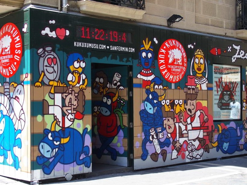 Интересна сеть Kukuxumusu, первый магазин которой был открыт в Памплоне в 1989 году, а теперь вы можете встретить такие во многих городах Испании. Смешные мультяшные картинки печатаются на всем, что только возможно — от футболок до зонтиков. Дизайнеры Kukuxumusu разрабатывали сайт фестиваля Сан-Фермин. Вот так выглядит фасад памплонского магазина во время проведения энсьеррос: