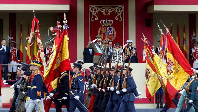 Основные праздничные события и зрелища проходят в Мадриде. В испанской столице утро национальной фиесты начинается с подъема флага страны, на котором присутствуют королевская семья, правительство, иностранные послы. Торжество продолжается военным парадом сухопутных и воздушных вооруженных сил. Реактивные истребители, раскрашенные в национальные цвета, рисуют в небе флаг Испании.