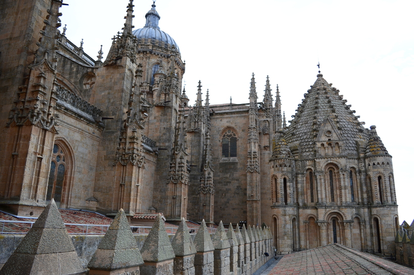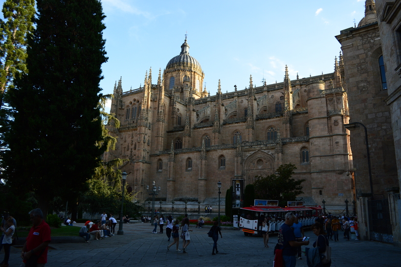 В 16 веке население Саламанки значительно выросло, поэтому было решено построить новый кафедральный собор, лучше и больше старого. Строился он на протяжение двух веков с 1513 года, в начале в стиле поздней готики, потом барокко. Собор настолько огромен, что его видно из любой точки города. Думаю, что на башню тоже можно подняться, но мы внутрь не заходили, поэтому не знаю.