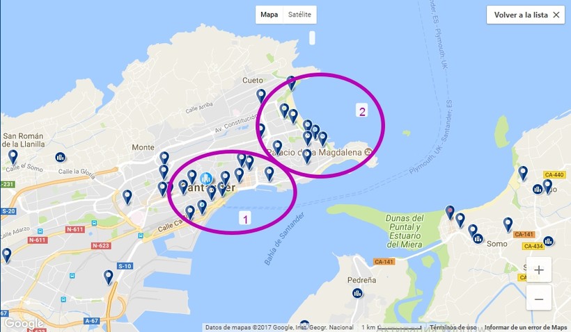 А вот зимой лучше остановиться в части, отмеченной пунктом 1. Здесь вы найдете и отели, и апартаменты с приятными видами на залив, и в то же время будете находиться непосредственно в историческом центре. Для путешественников, перемещающихся на общественном транспорте, близость автовокзала будет очень кстати. А к Ла Магдалене или на набережную Сардинеро можно прогуляться.