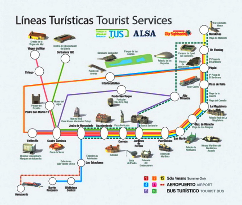 По Сантандеру ходит туристический автобус, его маршрут пролегает в основном по береговой линии, длится один час, останавливается в 8 местах. Стоимость — 15 EUR. По моему мнению цена высоковата, и особого смысла в такой экскурсии я не вижу.