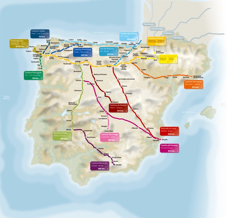 Часть путей пересекается или переходит одна в другую. Например, идя по «Северному пути» в какой-то момент становишься перед выбором: продолжать путь по побережью или свернуть на старинную дорогу Camino Primitivo.