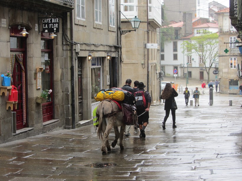 Тем не менее приход в Сантьяго радостный. Чем ближе к городу, тем больше пилигримов встречается ну пути. Разные Камино сходятся в один, здесь же на площади перед собором отдыхают усталые путники, можно встретить и собак, и ослов, и пеших странников, и велосипедистов.