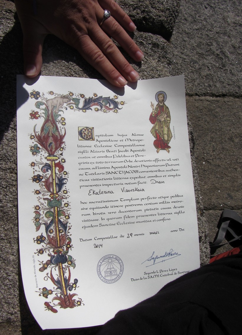 В конце пути, в городе Сантьяго-де-Компостела, паломникам выдают сертификат. Чтобы его получить, достаточно пройти последние 100 километров или проехать 200 километров на велосипеде.