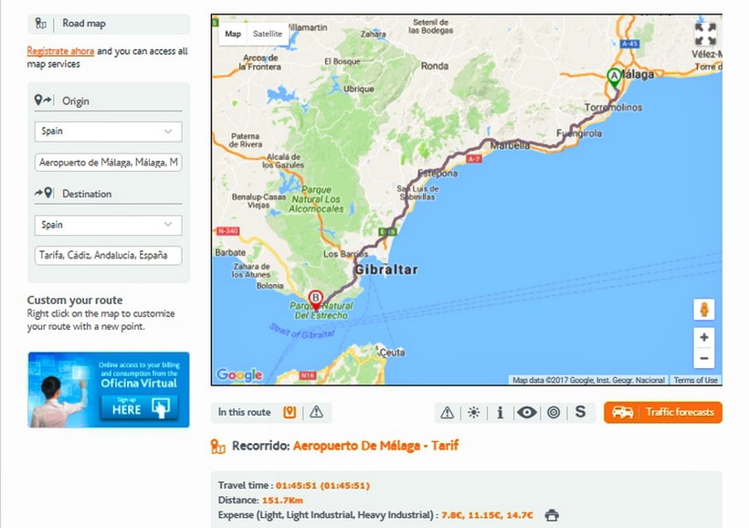 Частично дорога платная, стоимость пути до Тарифы для легкового автомобиля составит 7,8 EUR. Чтобы расходы на оплату дорог в Испании не стали для вас неприятной неожиданностью, советую использовать калькулятор на этом сайте: