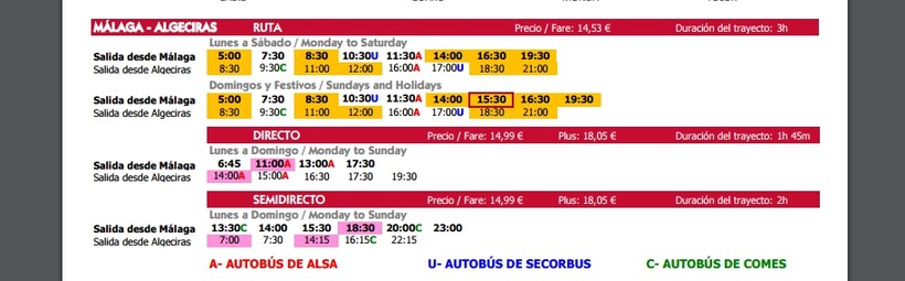 Обратите внимание, что автобус проходит по всему побережью Средиземного моря и частично по атлантическому и останавливается в основных курортных городках, так что и отдыхающие на Коста дель Соль и Коста де ла Лус могут воспользоваться данным маршрутом.